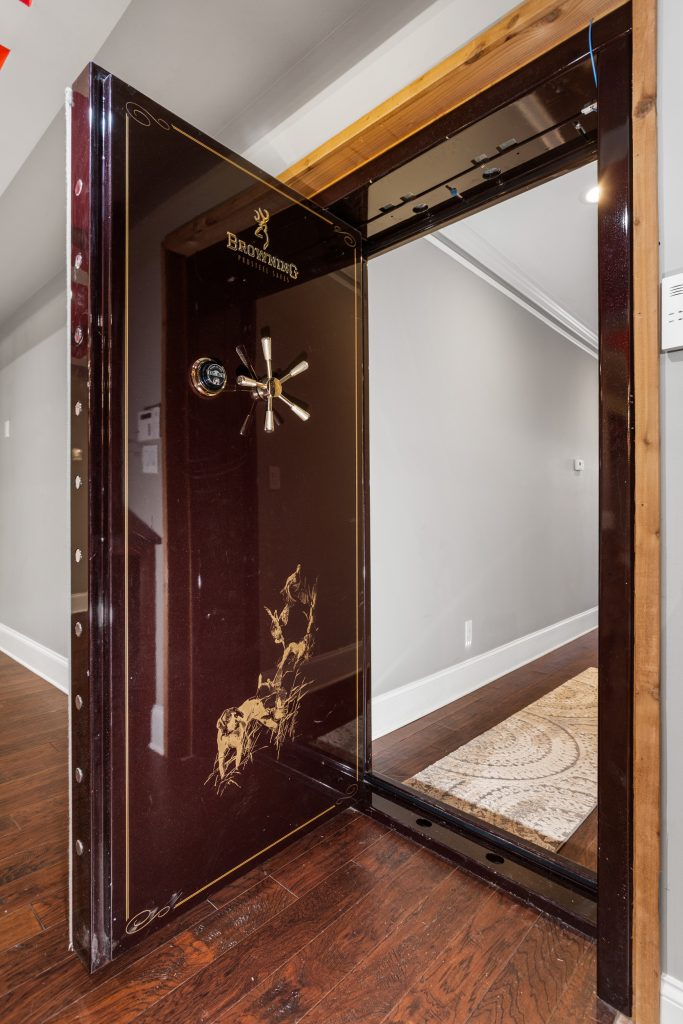 Entry is through a full-size Browning safe door — one of the most trusted names in secure storage. Once inside, the space opens into a curated collector's environment that feels closer to a private gallery than a residential home.