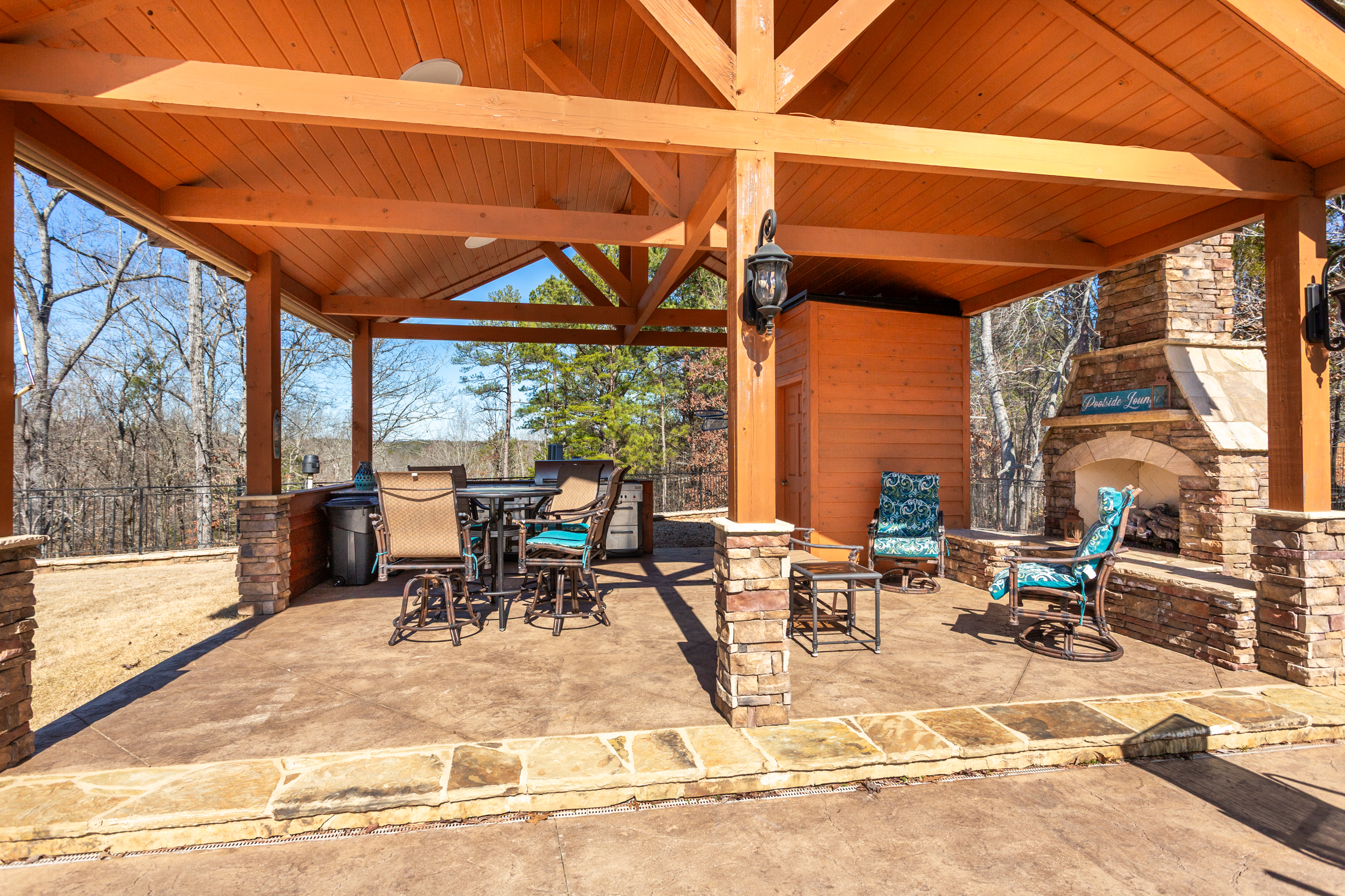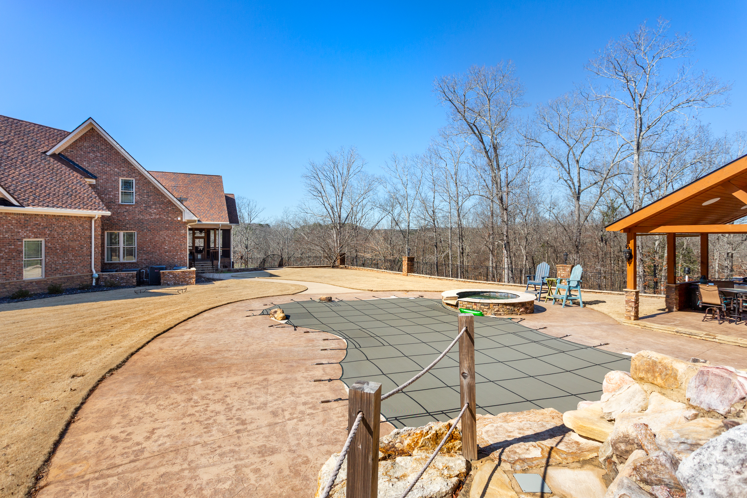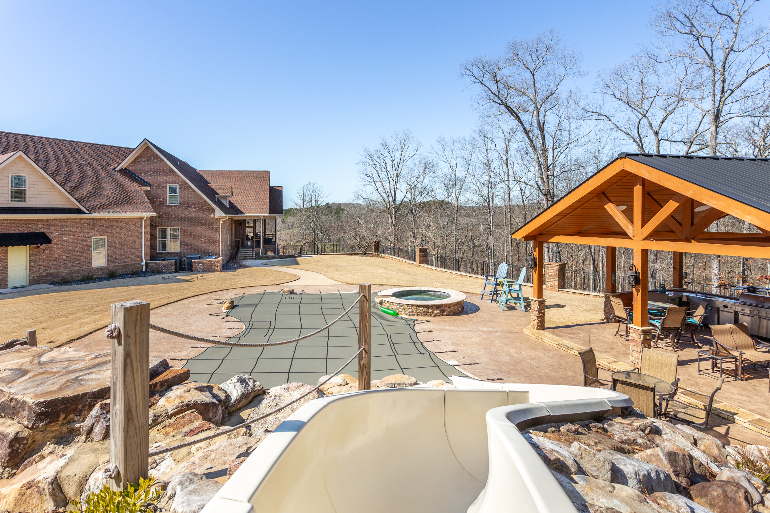 Step outside and the property transforms into a private resort. Whether you're launching from the riverbank before sunrise, sliding into the pool at noon, or gathering around the portico fireplace after dark — the outdoor grounds were built to be lived in, not just admired.